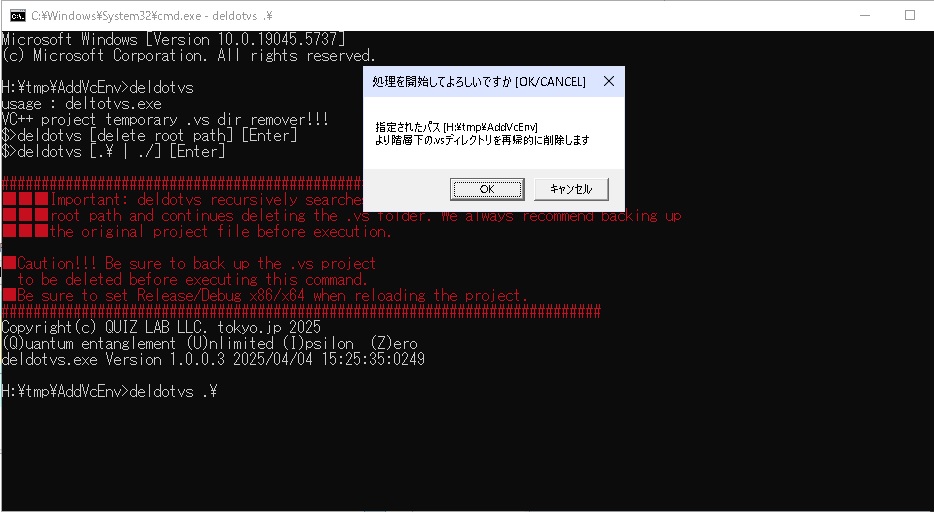 試しにH:ドライブのリムーバブルディスクにコピーしたVC++ GUIプロジェクトに対しdeldotvsを実行して