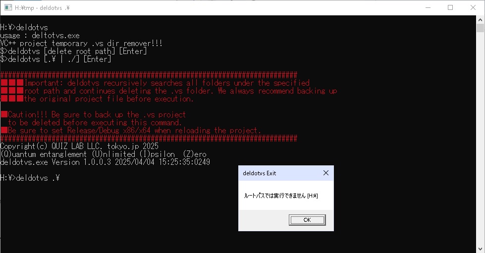 MessageBoxで実行ルートパスを表示して確認を促します。 (-s オプションで問答無用に実行するこ